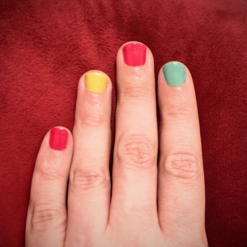 Thuis experimenteer en speel ik met de kleuren. In het openbaar test ik wat de verschillende tinten doen. Ik vind het opvallend dat de mannen die inmiddels nagellak dragen, toch doorgaans kiezen voor normatief zwart of veilig donkerblauw. De caissière van de supermarkt geeft me een knipoog als ik mijn pinpas tegen de scanner houd. Mintgroen lijkt ontwapenend te werken, maar magenta is misschien wat te pittig voor mij nu. Verder blijkt het aanbrengen een nauwgezet werk, maar vooral een daad van koestering, expressie, geduld en zelfliefde.