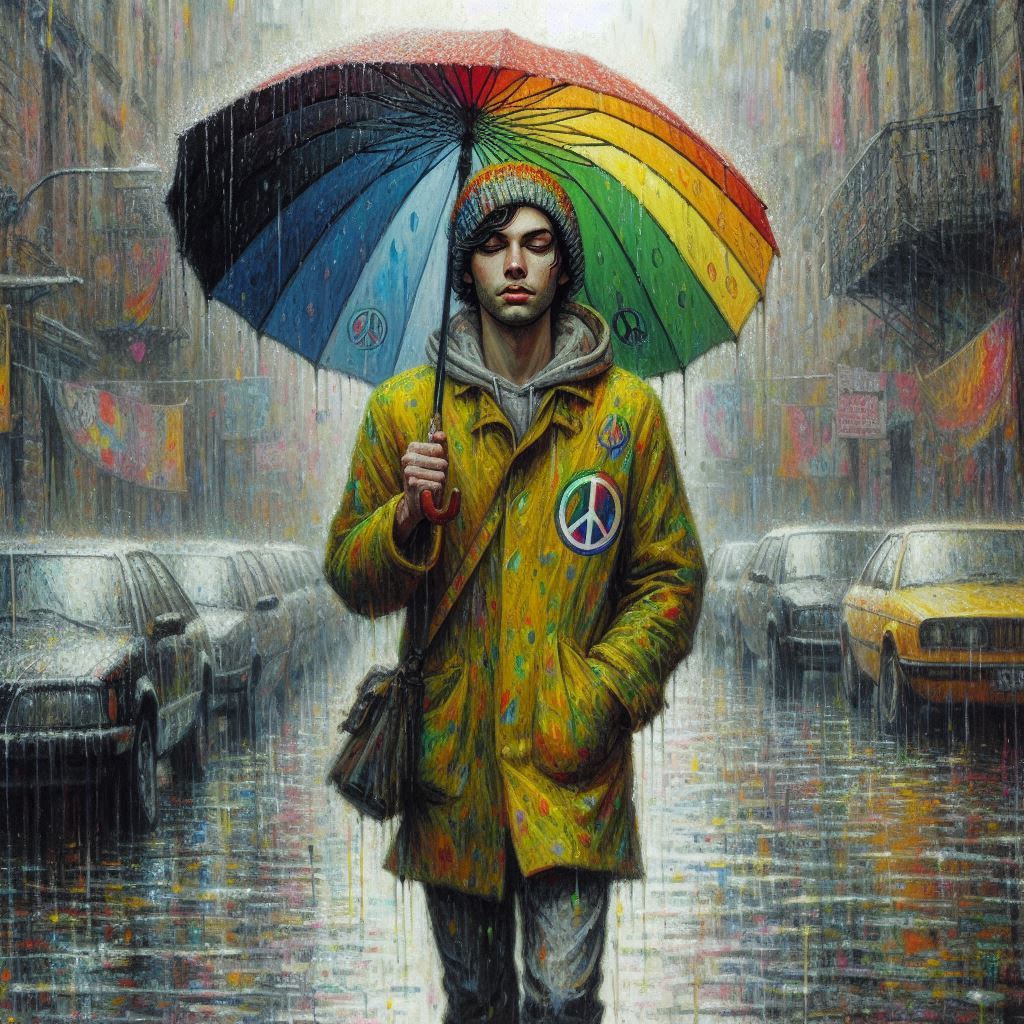 Mijn provisorische A4’tje, met daarop “Be yourself, no matter what they say”, een citaat van queerlegende Quentin Crisp, ontlokte af en toe een glimlach, maar bleek geen partij voor de regen. Na tien minuten was het een papperig vod.
